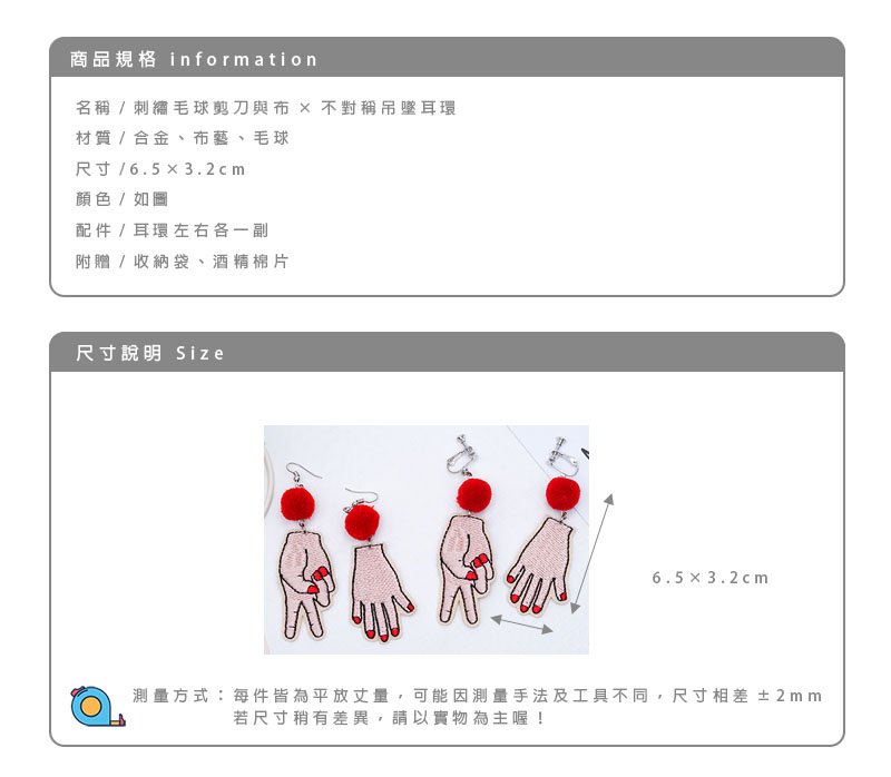 - 刺繡毛球剪刀與布×不對稱吊墜耳環