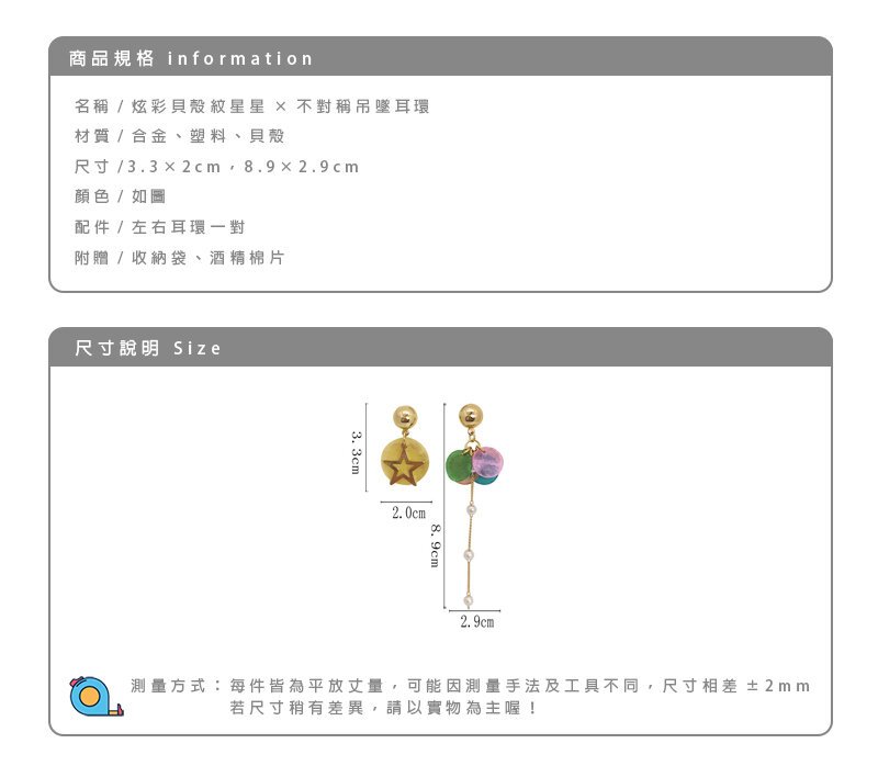 - 炫彩貝殼紋星星×不對稱吊隊耳環
