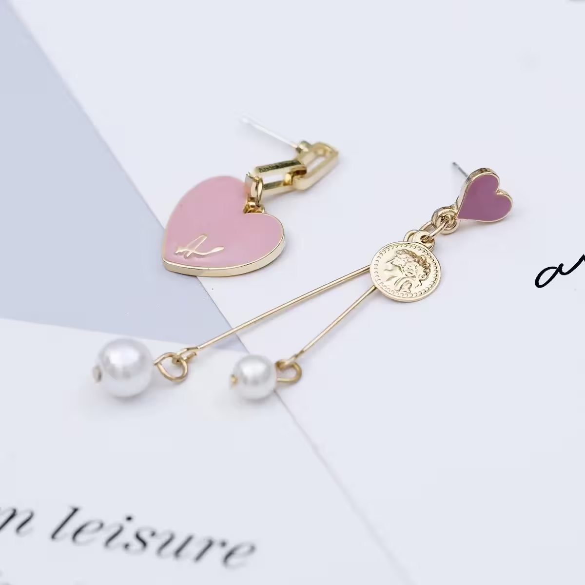 ▶名稱/粉紅愛心希臘古幣×不對稱吊墜耳環