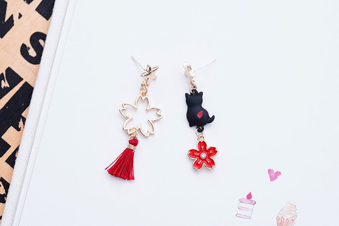 黑貓紅櫻流蘇×不對稱吊墜耳環-第1張
