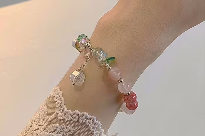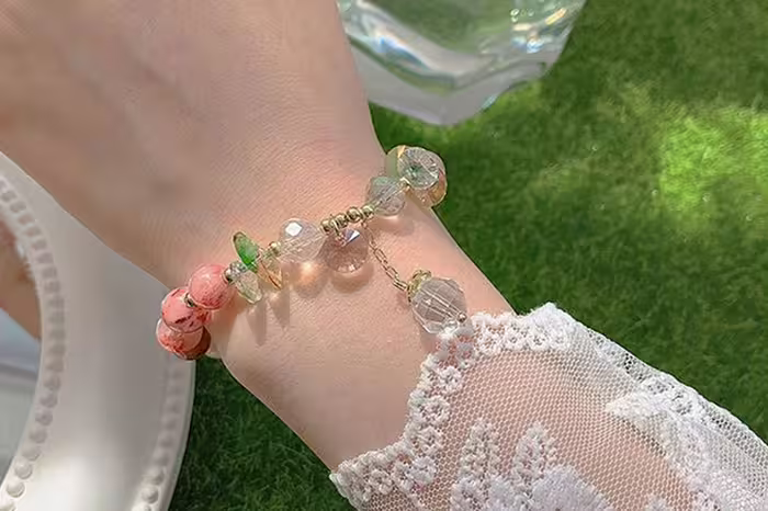 ▶名稱/紅莓粉晶綠葉×固定式串珠手鍊
