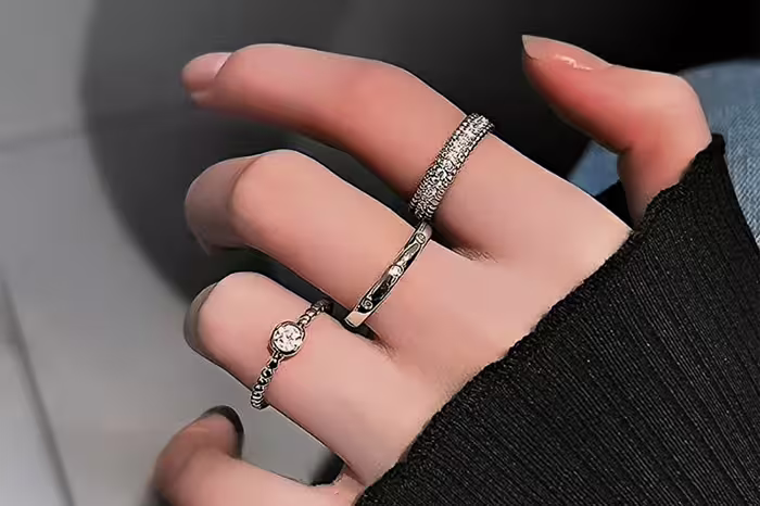 ▶名稱/點點紋寬窄鋯鑽×三套件戒指組×銀色