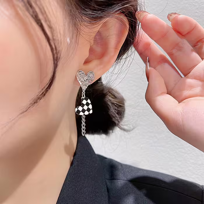 ▶名稱/黑白格紋小熊愛心×不對稱吊墜耳環
