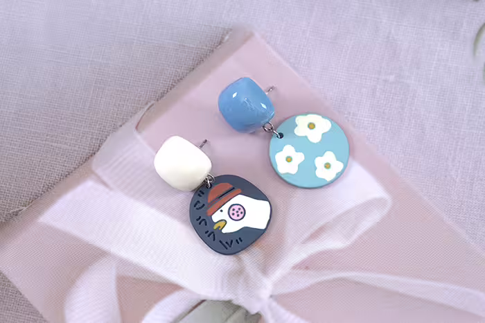 加油鴨藍色小花×不對稱吊墜耳環