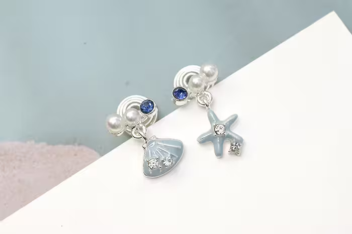 ▶名稱/水藍海星貝殼×不對稱蚊香盤U型耳夾
